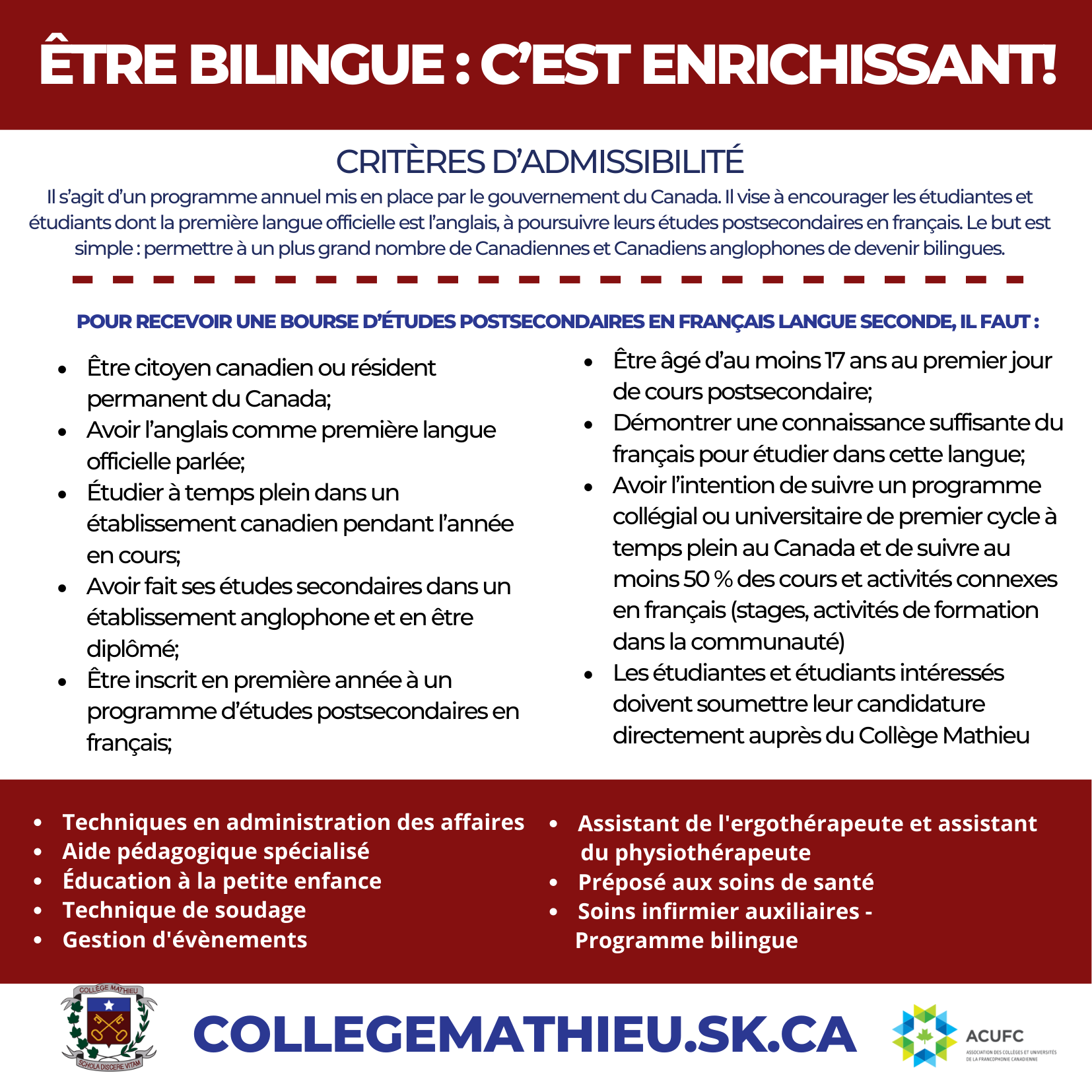 - Être inscrit en première année à un programme d’études postsecondaires en français au Collège Mathieu