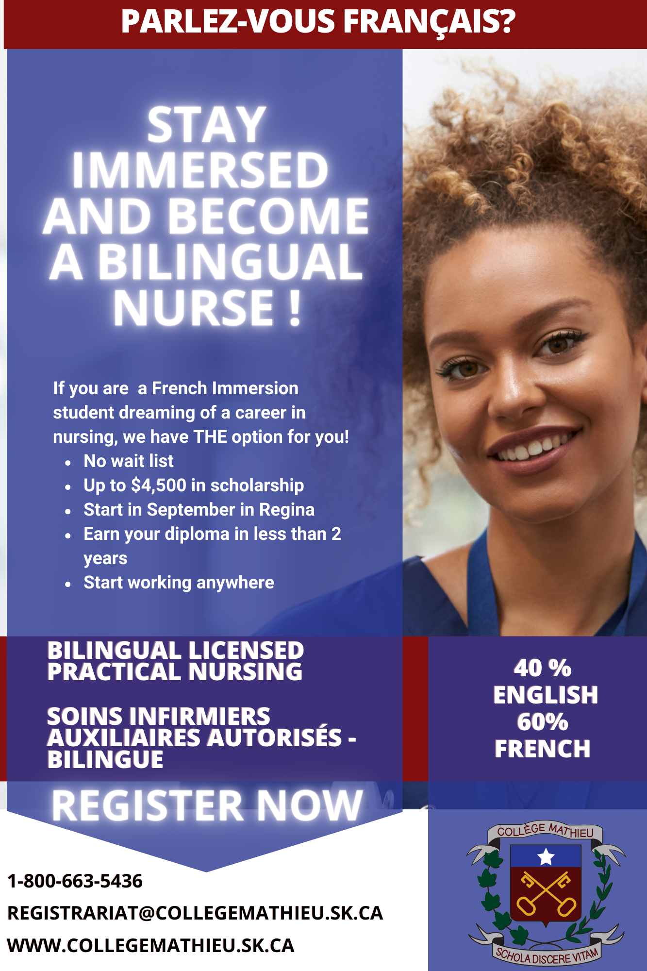 Cherchez pas plus loin! Le programme d'infirmière auxiliaire autorisée bilingue du Collège Mathieu a ce qu'il vous faut - avec un contenu à 60 % en français et à 40 % en anglais, plus une chance de gagner des bourse jusqu'à 4 500 $ si vous êtes l'un des premiers inscrits! Il s'agit de cinq (5) bourses d'entrée de 1 500 $ chaque + cinq (5) bourses de 3 000 $ pour les étudiants d'immersion francophone. Réclamez les vôtre aujourd'hui!